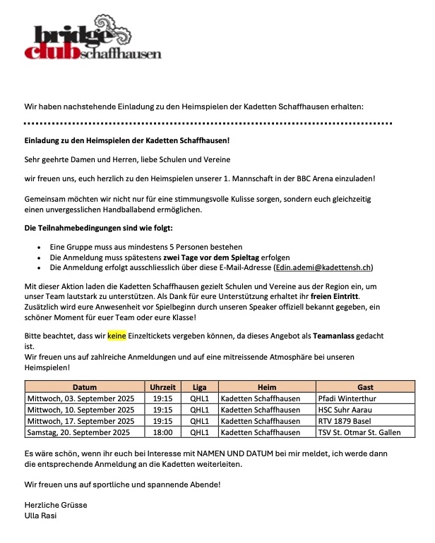 Kadetten Heimspiele 03.09.-20.09.2025