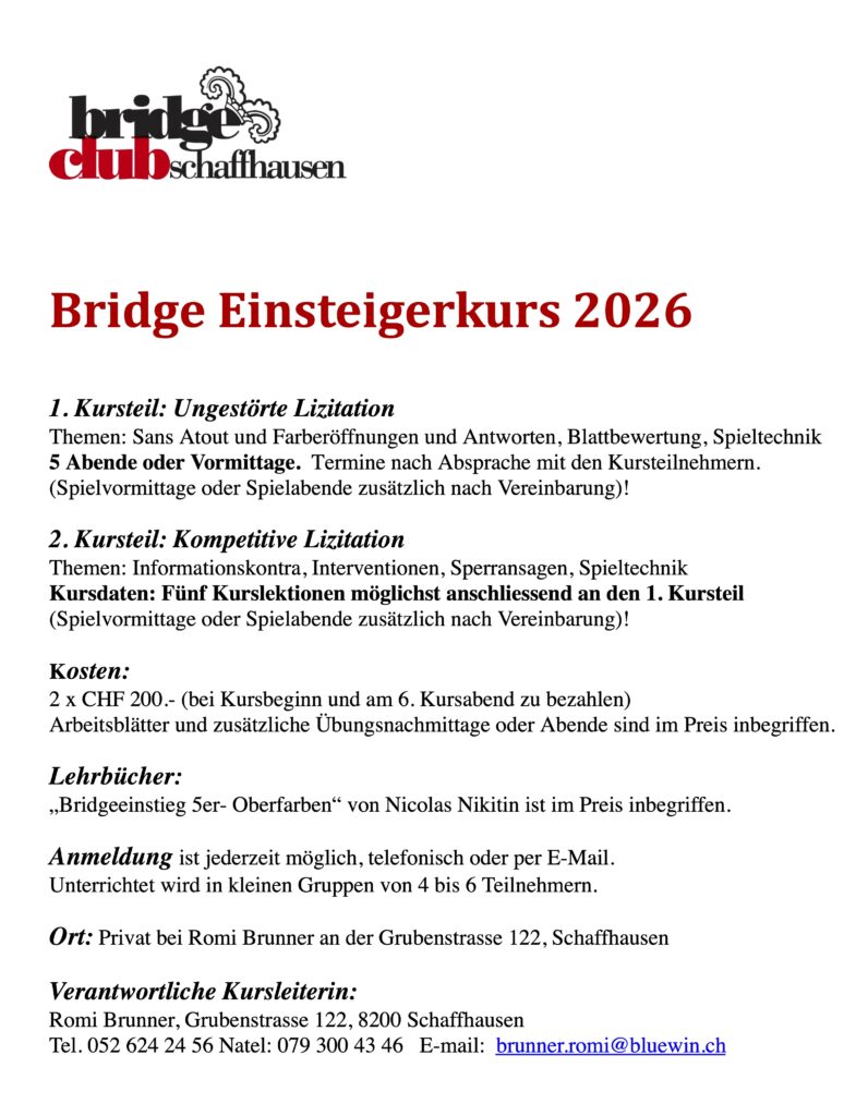 Bridge Einsteigerkurs 2026 Foto: Theres Bosshard Auskunft und Anmeldung bei Romi Brunner (siehe oben). © Copyright Bridge-Club Schaffhausen Impressum Datenschutzerklärung Hilfe